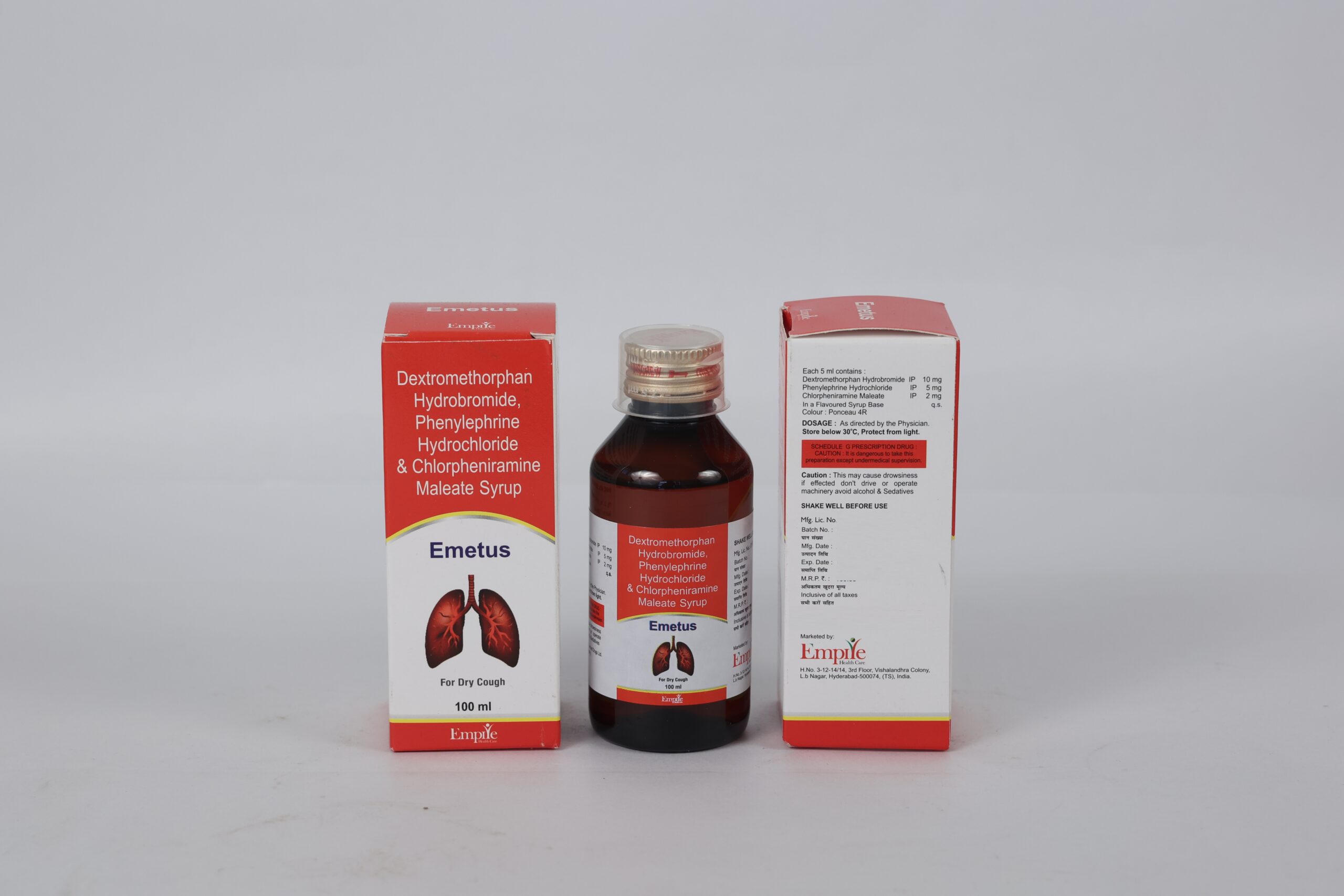 Home / Uncategorized / EMETUS 100 ML EMETUS 100 ML Dextromethorphan Hydrobromide IP 10mg + Phenylephrine Hydrochloride IP 5mg + Chlorpheniramine Maleate IP 2mg Syrup Category: Uncategorized Related products EMZILID -600 Read more EMCEF-200 Read more EMORAL-P Read more EMCEF CV 325 Read more
